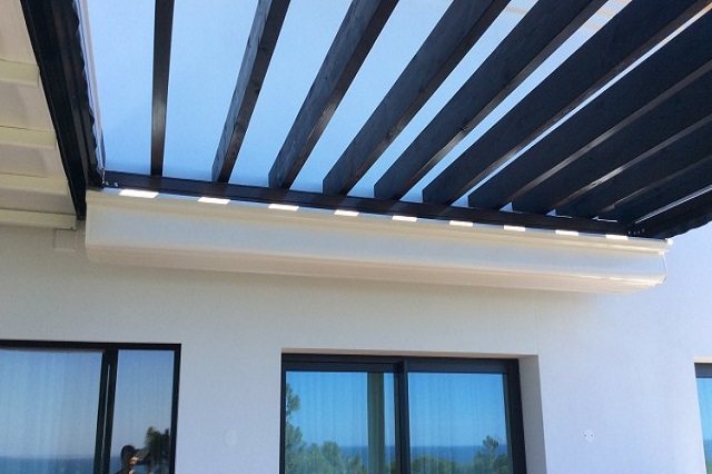 Pergola motorizada entreparedes con lona tensada.