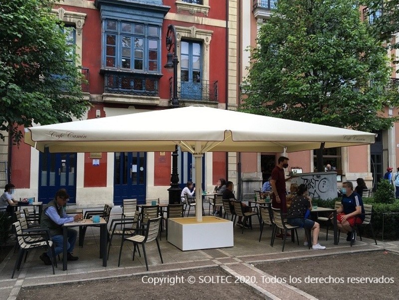 Instalacion de parasol extra rectangular 350 x 650. Base jardinera acero cincado 1100x1100x510 mm. Sistema led encapsulado en antebrazos.
